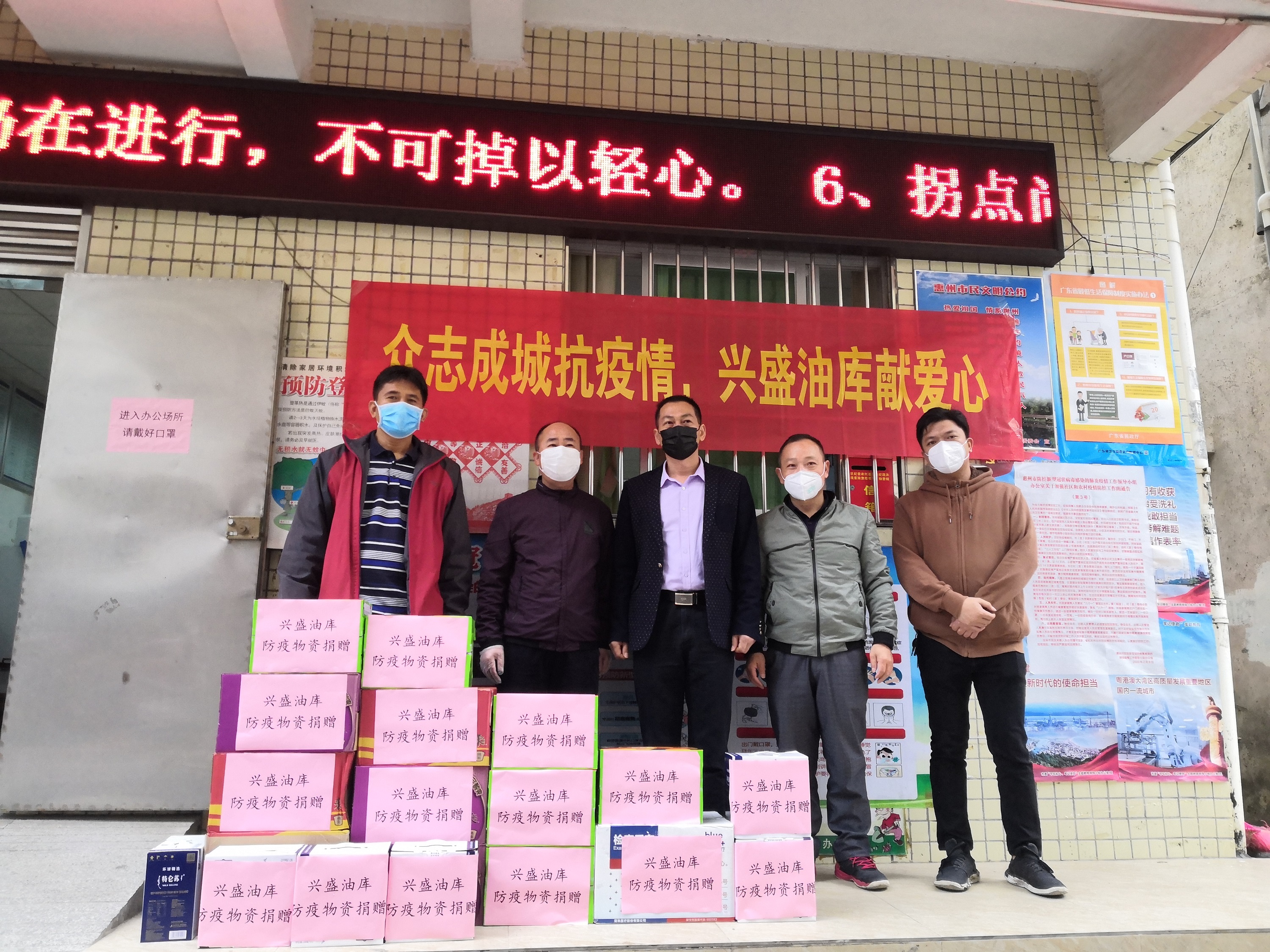 2020年3月5日,興盛油庫開展“共抗疫情”慰問一線防疫人員獻愛心活動,為惠州大亞灣澳頭街道橋西社區(qū)送去600個口罩和18箱防疫物資,將溫暖關懷送到他們心坎上。