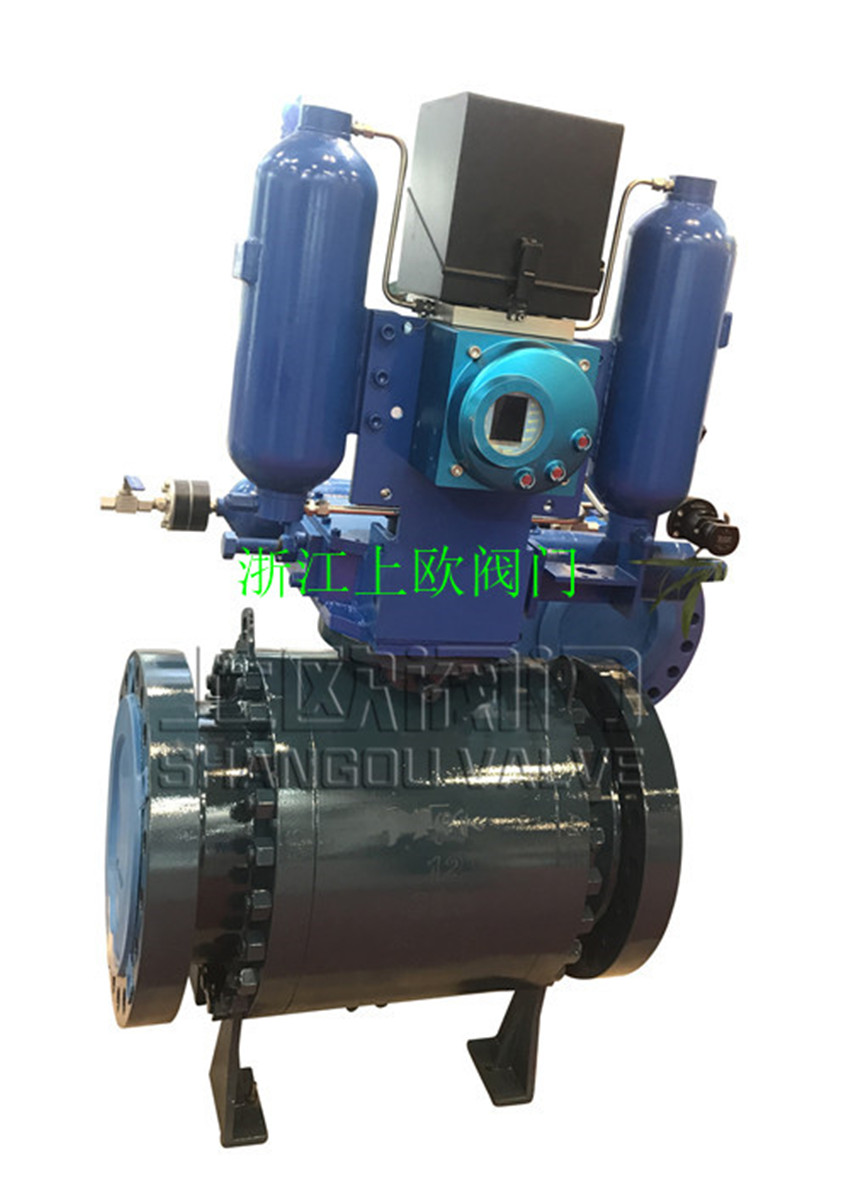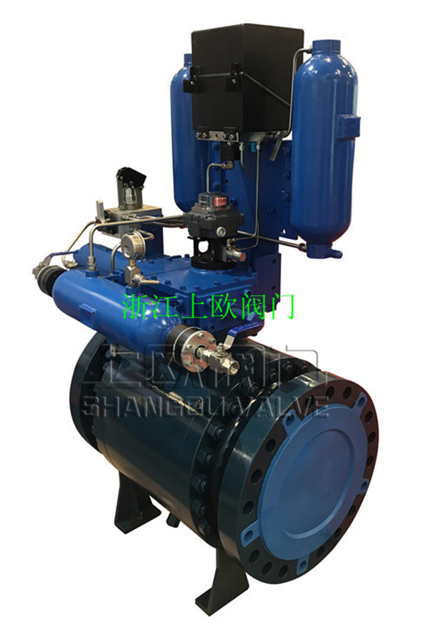 上歐閥門生產的氣液聯(lián)動球閥由氣液聯(lián)動執(zhí)行器和高壓球閥組成。氣液聯(lián)動執(zhí)行機構的動力源直接取自主管線的高壓天然氣,天然氣經過濾之后,直接進入儲氣罐儲存。采用集成模塊、大流量、高壓設計技術,使較少的控制元件承受高壓,延長密封件的壽命、減少配管、減少系統(tǒng)泄漏點從而提高了設備的整體安全性。 液壓系統(tǒng)具有傳動剛性強、不易壓縮、傳動平穩(wěn)、易于密封等優(yōu)點。氣體具有壓縮比大的優(yōu)點。氣液聯(lián)動執(zhí)行機構通過氣液傳動方式的轉換,將氣、液二者優(yōu)點得到完美結合。高壓氣體經過控制系統(tǒng)進入氣液罐轉換,罐體內等壓的液壓油被壓入相應的液壓活塞缸,同時液壓活塞缸液壓油流回到另一個氣液罐內,活塞動作帶動執(zhí)行機構驅動閥門實現(xiàn)平穩(wěn)的開或關。 氣液聯(lián)動執(zhí)行機構工作性能穩(wěn)定、動作可靠。通過調節(jié)液壓油的流量可調節(jié)執(zhí)行機構動作的全行程時間。