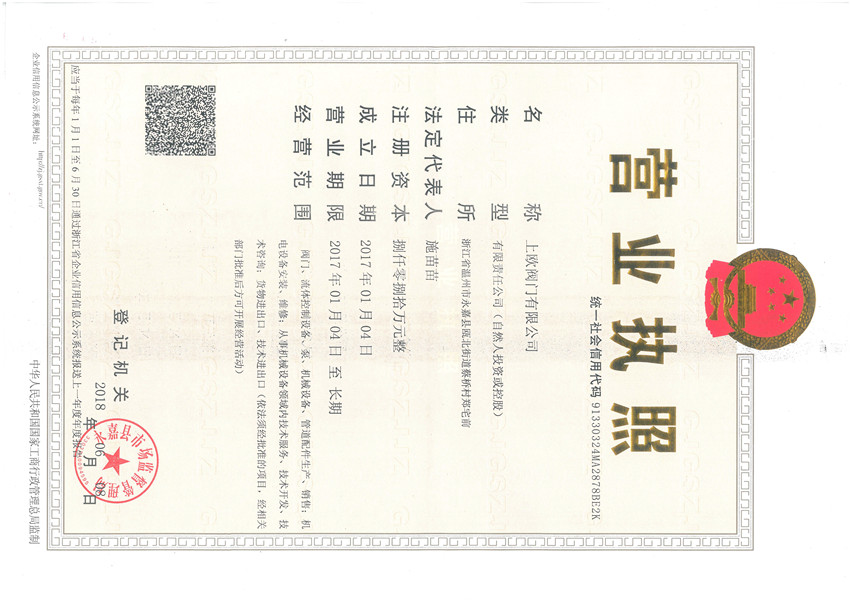 上歐閥門(mén)商標(biāo)注冊(cè)證書(shū)