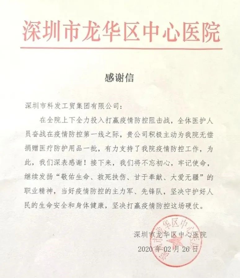 科發(fā)集團(tuán)向新田社區(qū)捐贈(zèng)愛(ài)心善款,并委托新田社區(qū)緊急采購(gòu)了一批醫(yī)療物資,于2020年2月26日送達(dá)龍華區(qū)中心醫(yī)院,為戰(zhàn)斗在一線的白衣戰(zhàn)士們助力。